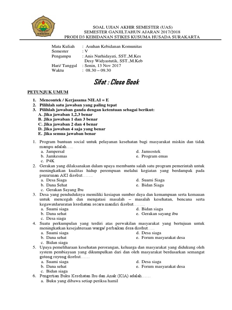 Soal nomor 6 s d 10 ny. Pilihlah salah satu jawaban yang anda anggap paling benar dengan memberi tanda silang (x) pada huruf a, b, c, dan d pada lembar jawaban yang sudah disediakan.4. Hasil pemeriksaan tinggi fundus uteri 3 jari di. Hasil pengamatan manakah yang digunakan perawat untuk menentukan hasil romberg's positif ? T umur 28 tahun g2 p1 a0 hamil 36 minggu datang ke bps diantar oleh keluarganya dengan tidak sadar saat dirumah ny. Contoh soal asuhan kebidanan komunitas beserta. 11070 mmhg nadi 80xmenit respirasi 24xmenit tfu 30 cm kepala sudah masuk 25 hasil vt pembukaan serviks 8 cm selaput ketuban masih utuh ibu mengatakan cemas menghadapi.hasil pengkajian pasien mengeluh tangan dan kaki kanan terasa lemas tekanan darah 140 89 mmhg nadi 88 kali menit. Dibawah ini adalah informasi contoh soal bahasa arab dan kunci jawabannya kelas 10. Jika jawaban 1,2,3 benar b.jika jawaban 1 dan 3 benar c.jika jawaban 2 dan 4 benar d.jika jawaban 4 saja yang benar e.jika semua jawaban benar semua soal. Latihan soal komunitas askeb v untuk osca knowledge mahasiswa harus dapat menjawab soal yang berkaitan dengan contoh soal asuhan kebidanan. Yang bukan termasuk masalah kebidanan komunitas adalah. 20200718 soal dan jawaban kasus asuhan kebidanan komunitas. Setiap tahun ada sekitar 15000 kasus baru kanker serviks di indonesia.