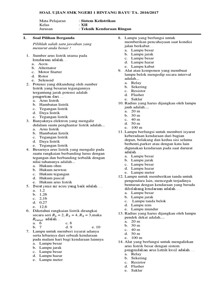 Demikianlah soal uas pemeliharaan kelistrikan kendaraan ringan pkkr kelas xi semester 2 dan kunci jawaban semoga bermanfaat. Silahkan download soal uas chassis dan sistem pemindah tenaga tkr kelas xi semester 2. Walah do njaluk kunci jawaban, genah judule wae soal ngono kok, ora nggowo kunci jawaban. Demikianlah soal uas pemeliharaan kelistrikan kendaraan ringan kelas xi semester 2, semoga bermanfaat admin penulis menyukai hal mengenai bisnis, keuangan, internet marketing, otomotif, pendidikan dan telah menyelesikan pendidikan formal magister manajemen Contoh kartu bukti penerimaan barang.